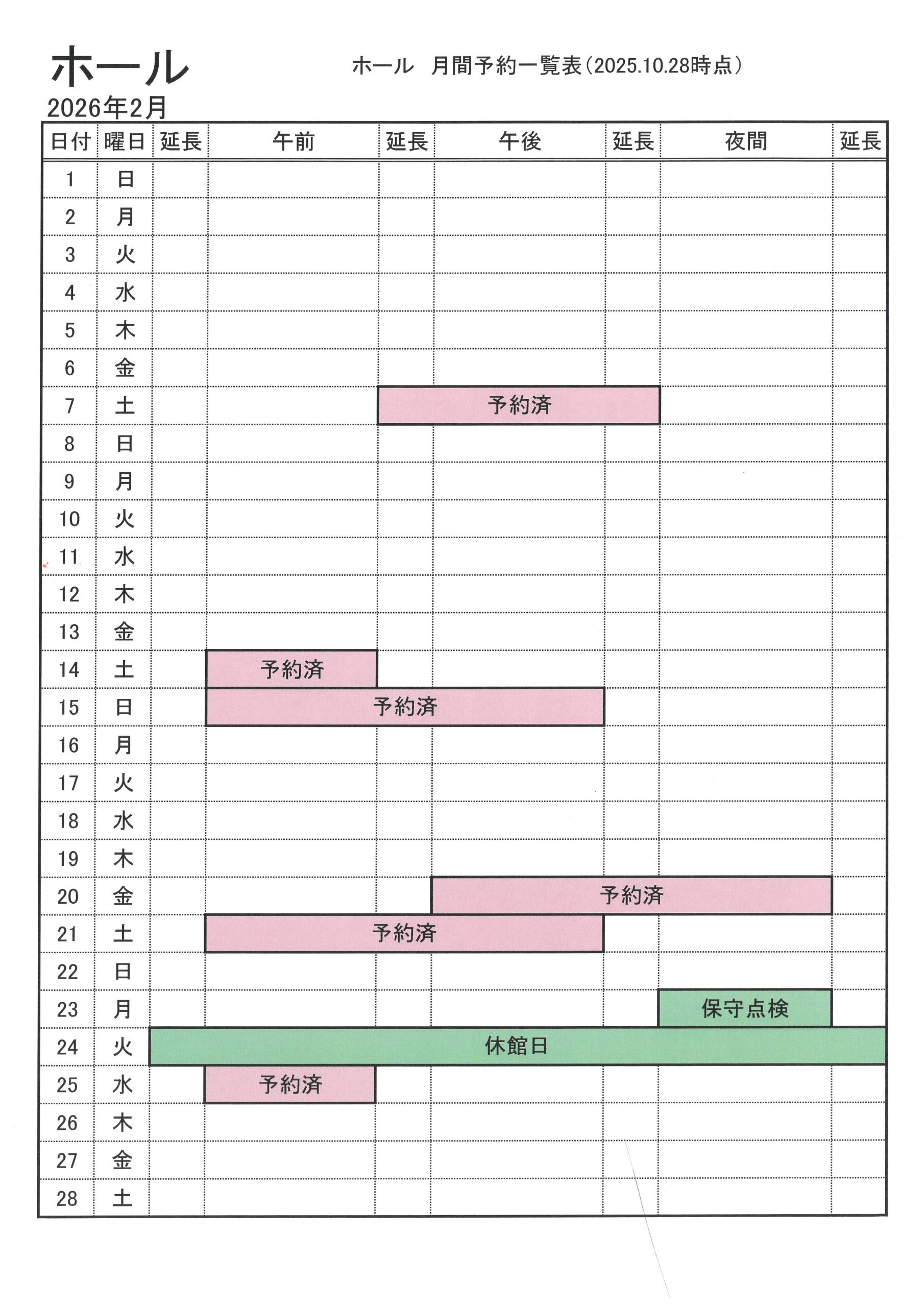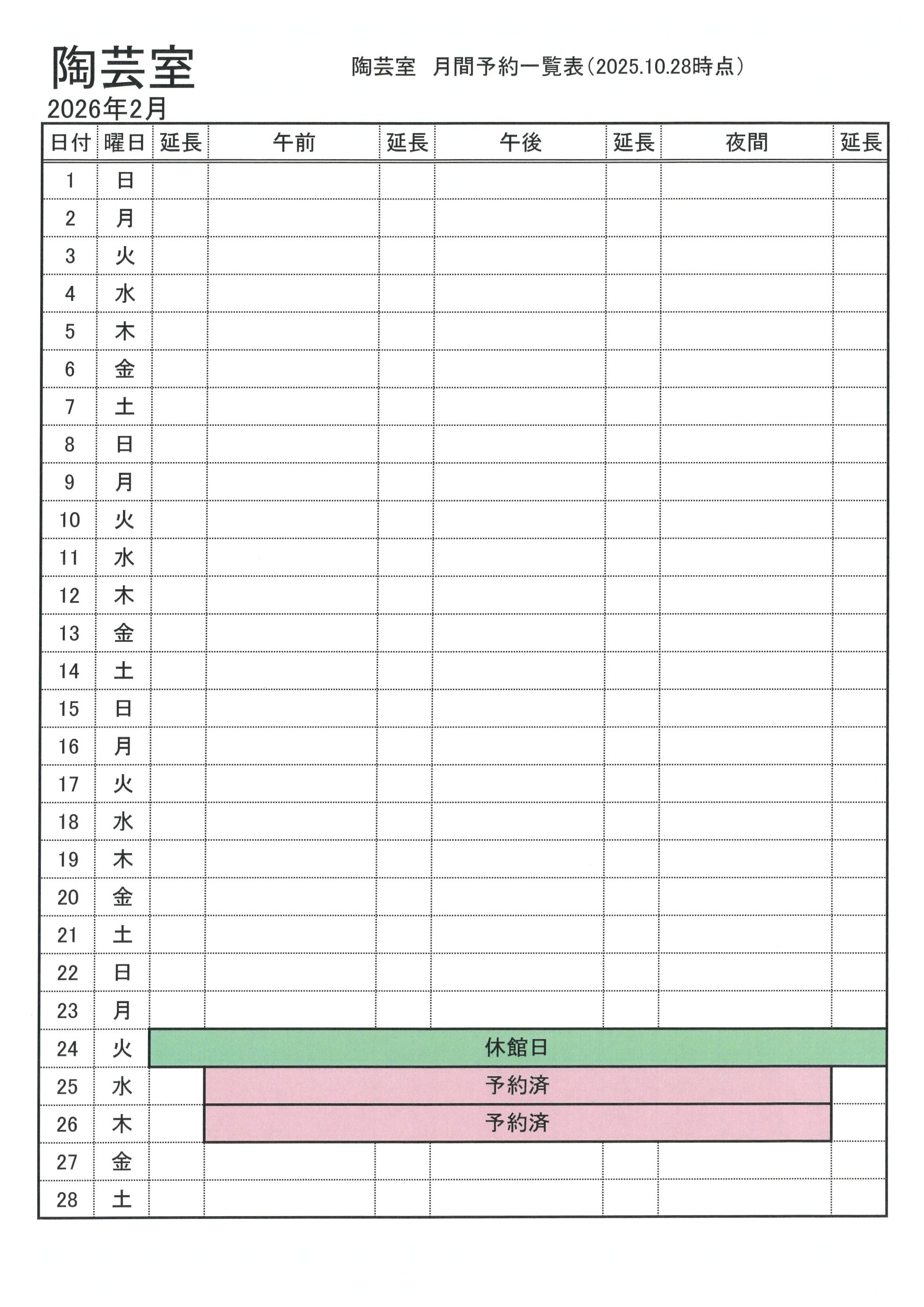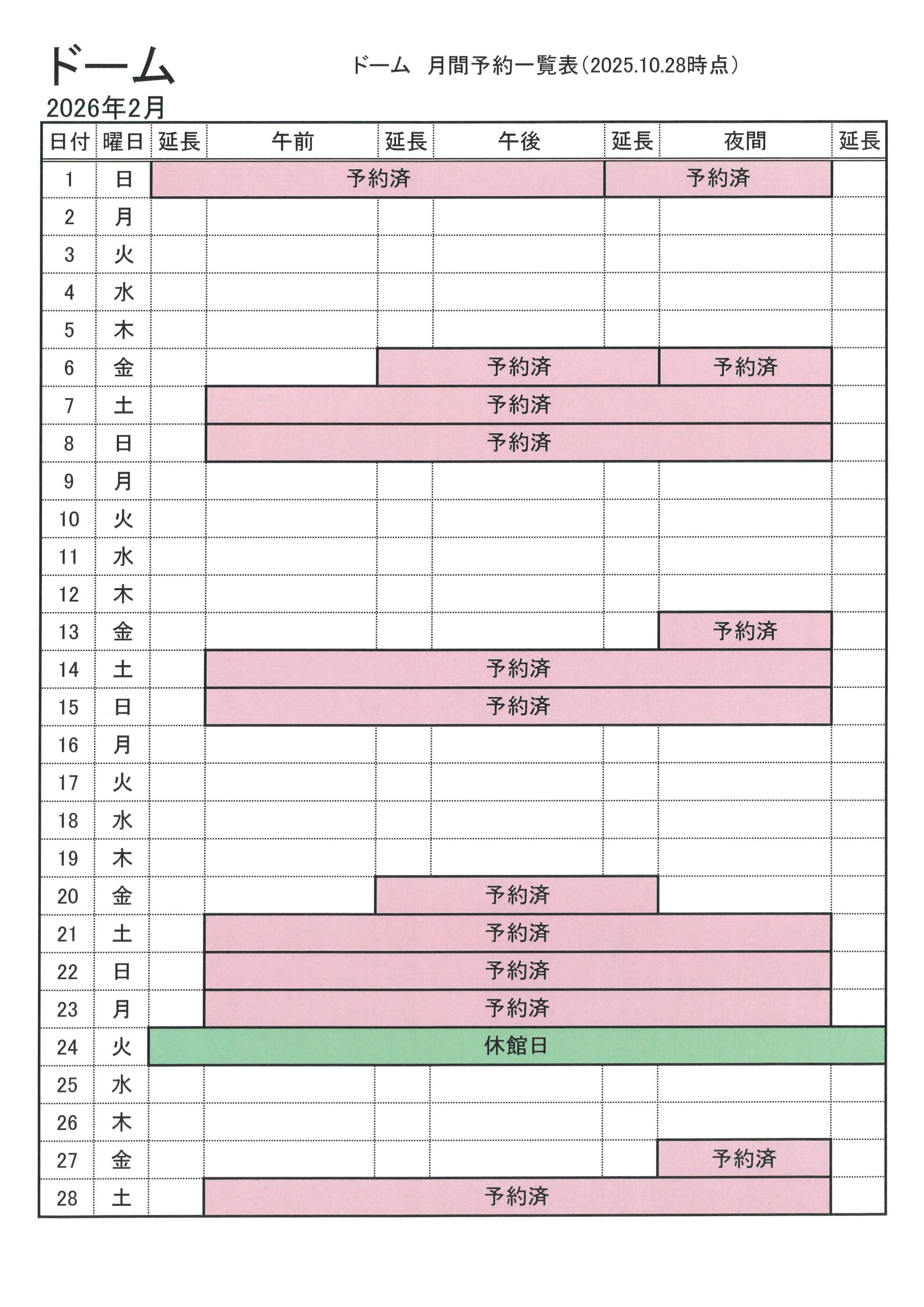 2026年2月分の抽選会対象施設の空き状況をお知らせします(2025.10.28時点)。