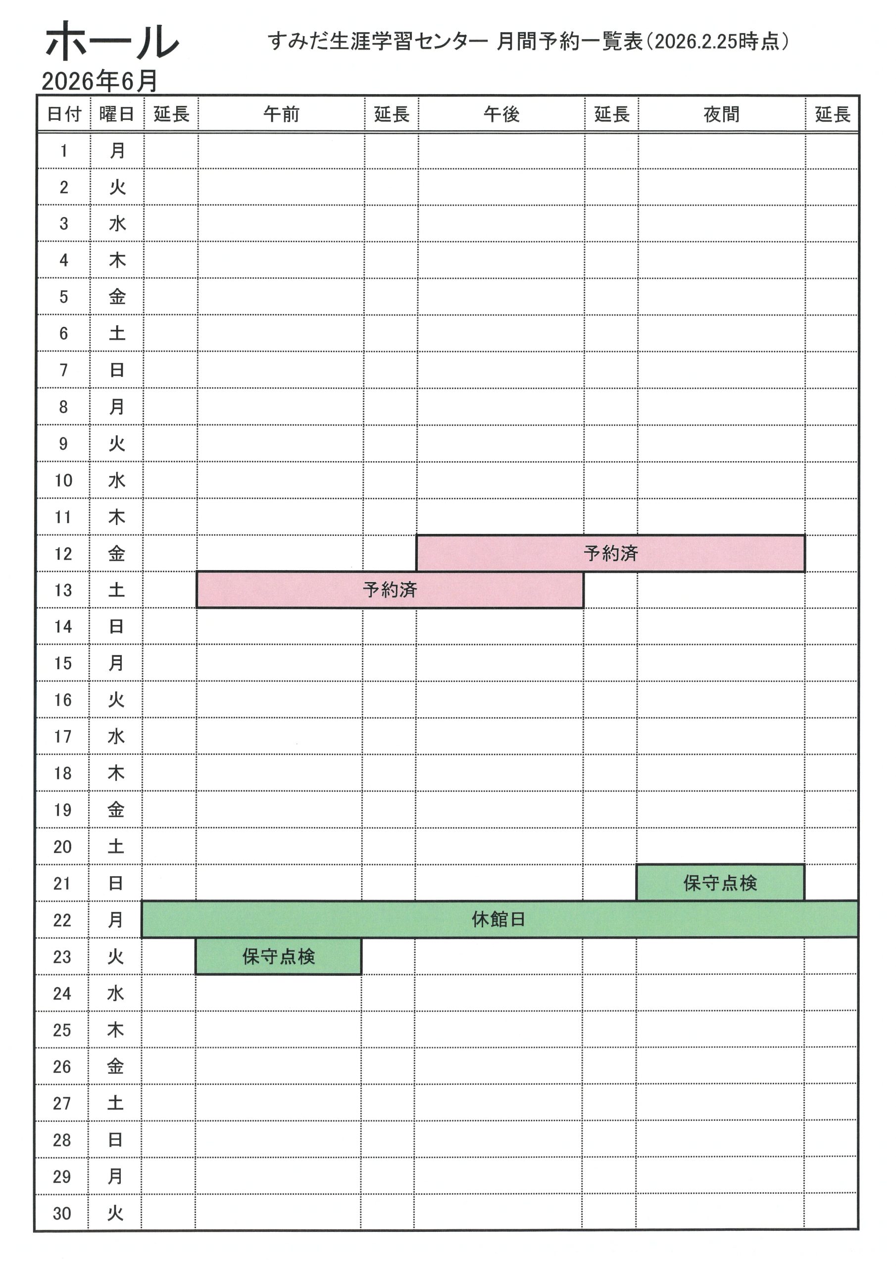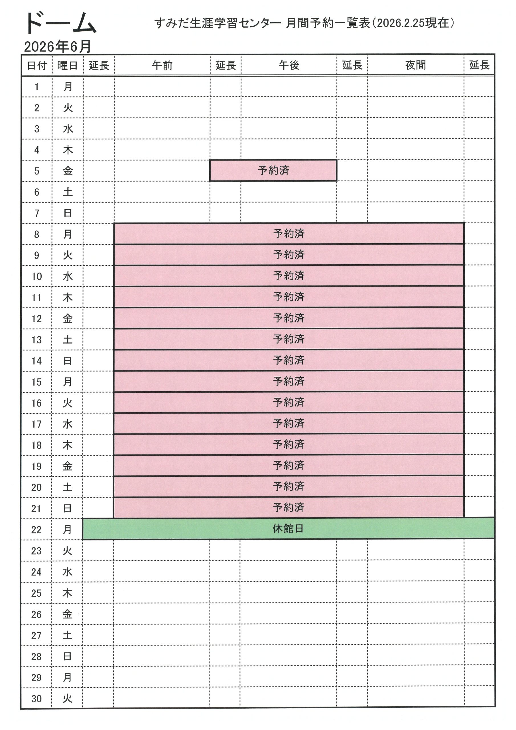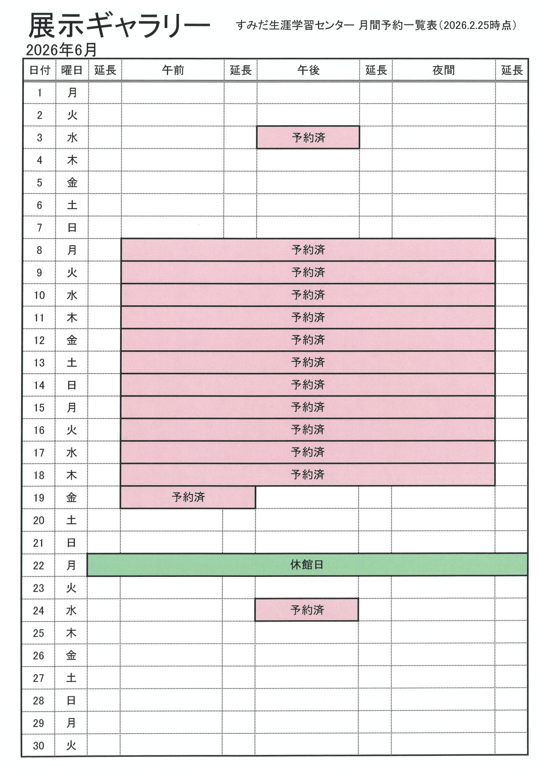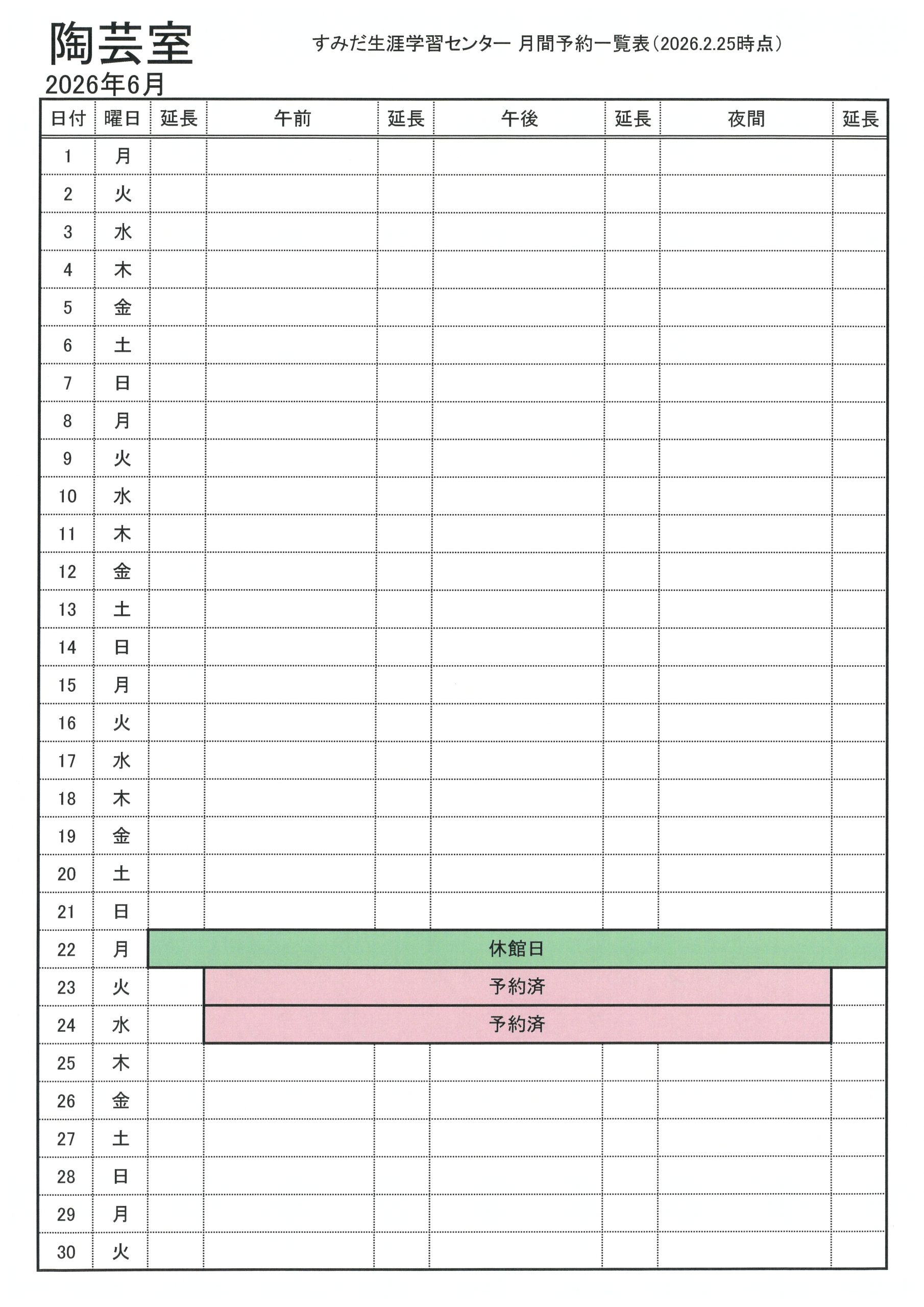 2026年6月分の抽選会対象施設の空き状況をお知らせします(2026.2.25現在)。