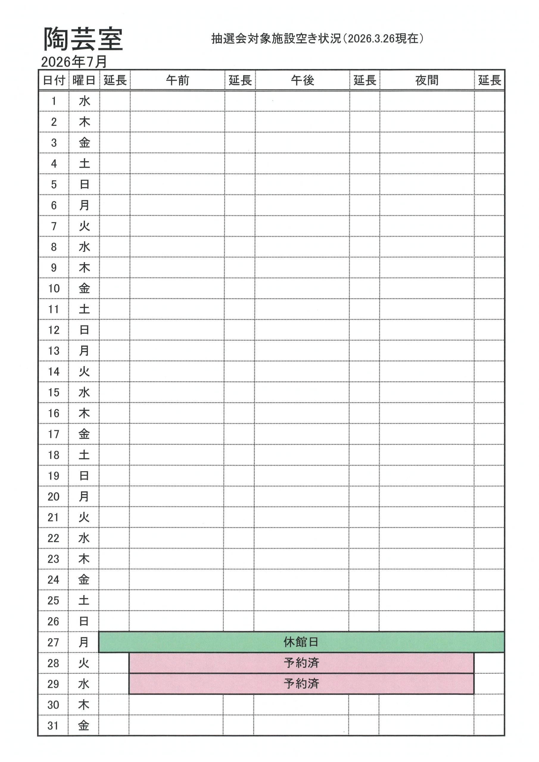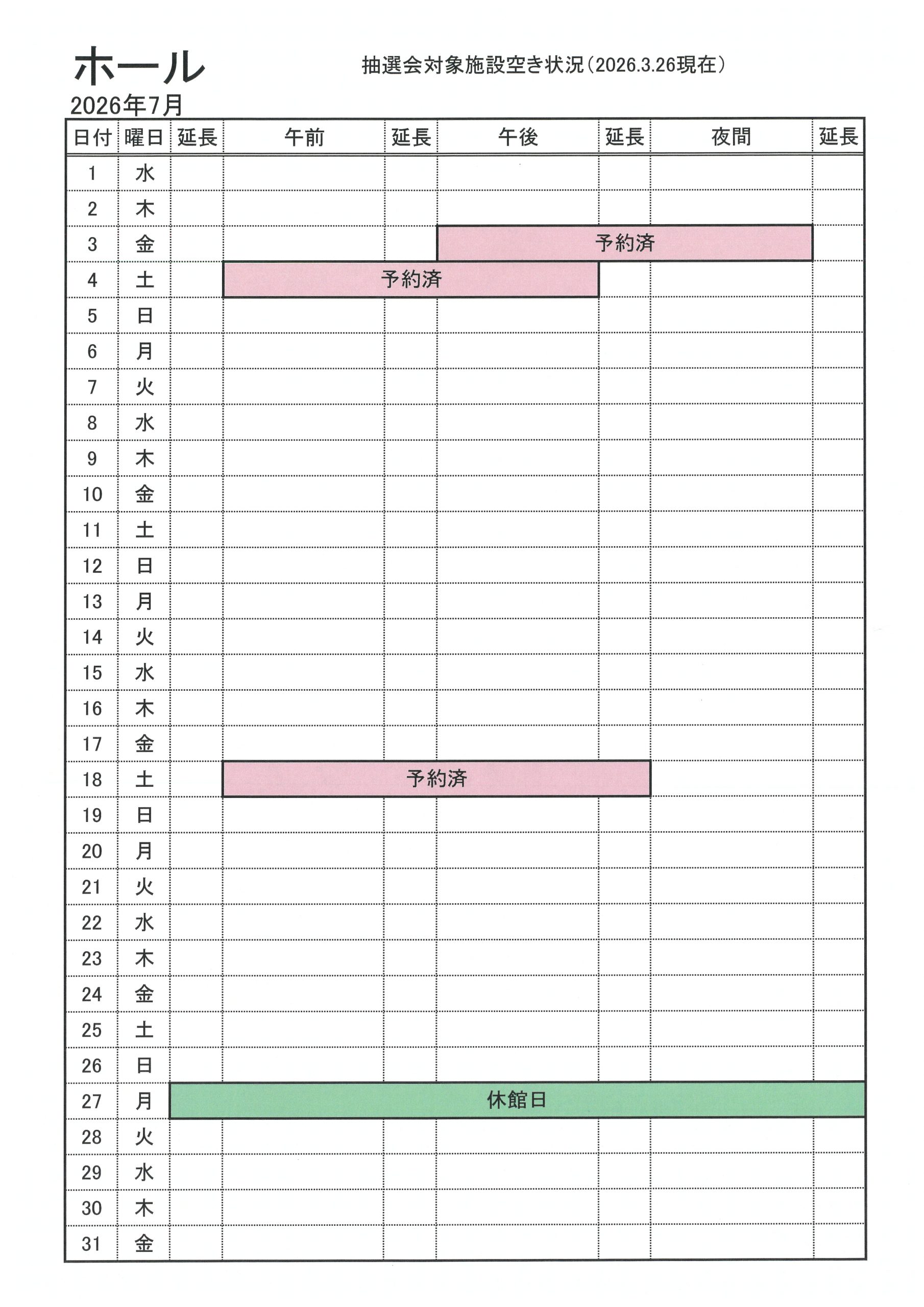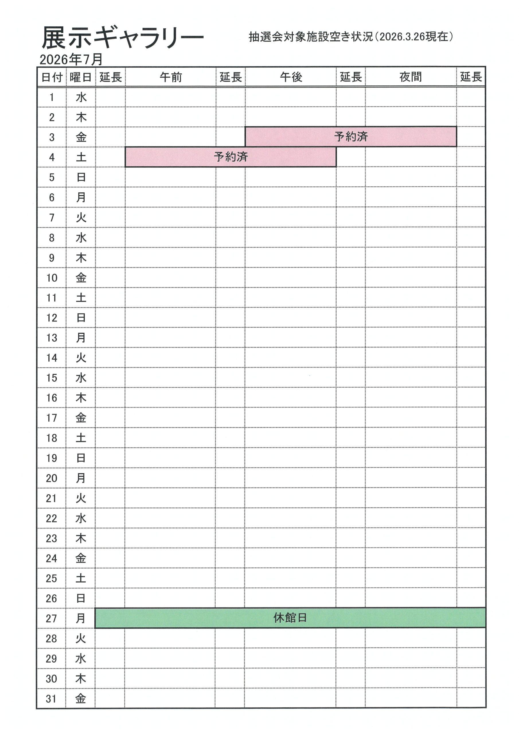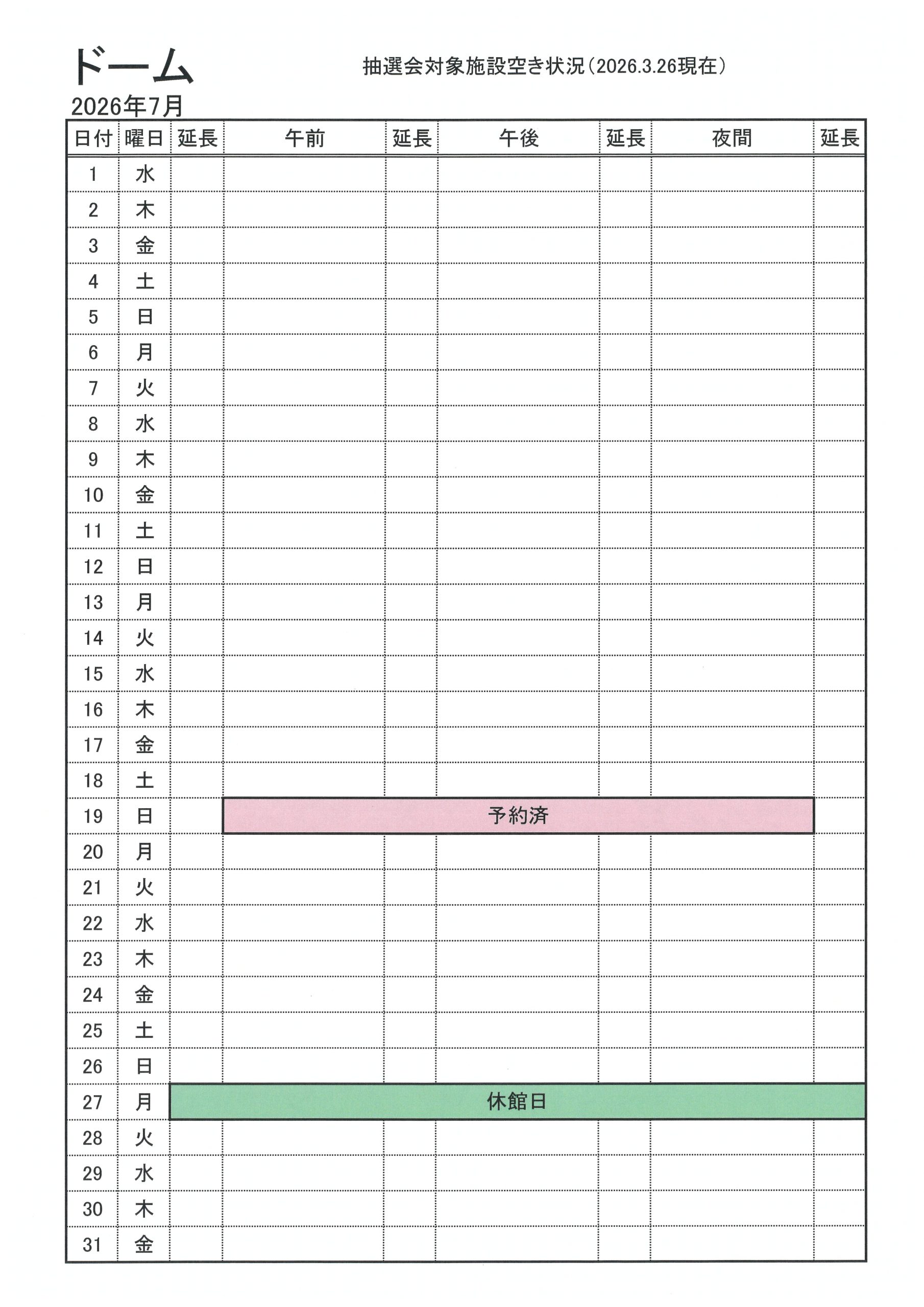 2026年7月分の抽選会対象施設の空き状況をお知らせします(2026.3.26現在)。