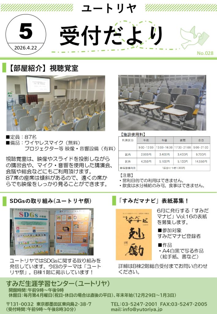 すみだ生涯学習センターでは、お部屋の紹介・貸館のご案内を月1回発行の「受付だより」にてお知らせしています。